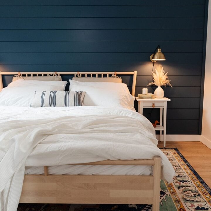 Deep Navy Shiplap Wall Paired With Crisp White Bedding + Natural Wood Accents