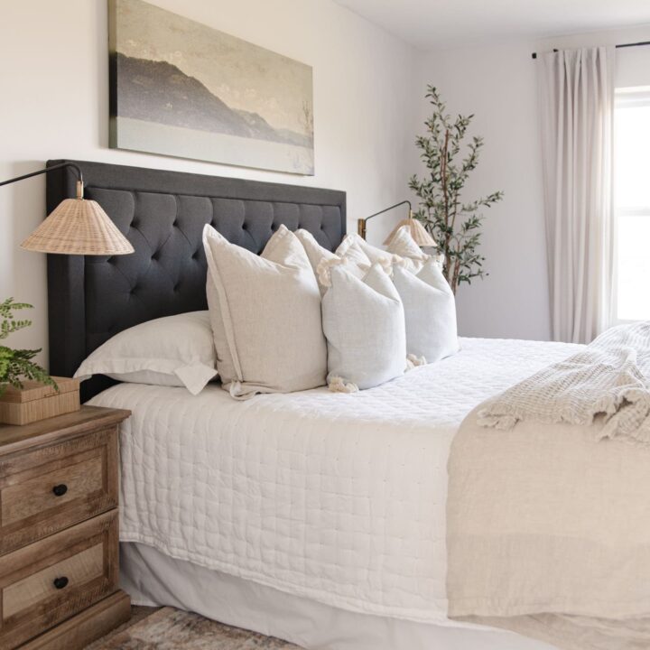 This room blends neutral tones with a bold black headboard, softened by linen bedding and cozy throw pillows.