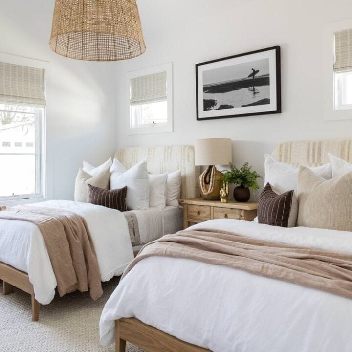 Twin beds wrapped in soft sandy tones and wicker textures make this room feel like a dreamy coastal getaway.