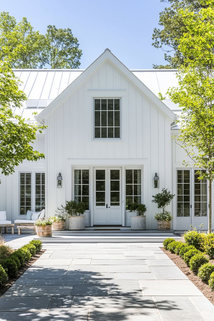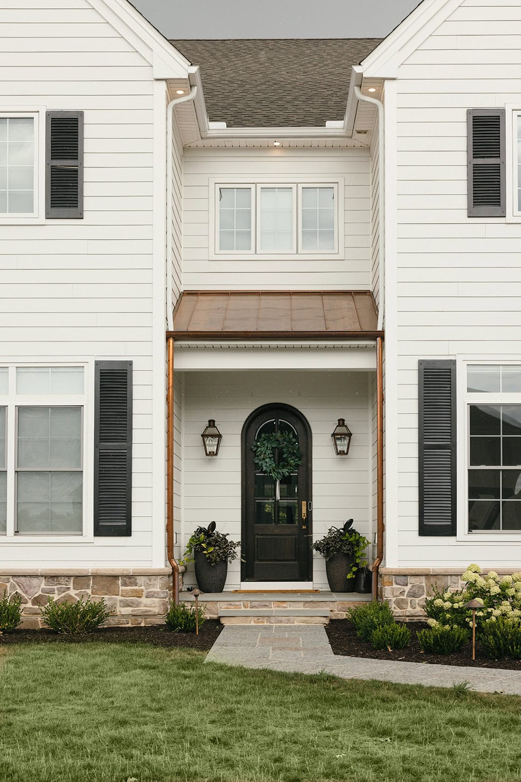 A classic pairing like soft white siding with navy blue shutters and doors creates instant curb appeal that feels fresh yet traditional at the same time.