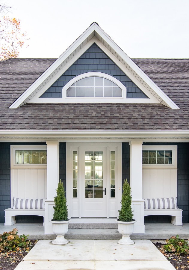 Navy blue shutters and doors paired with pale gray or white siding create that classic New England beach house vibe that never goes out of style anywhere.