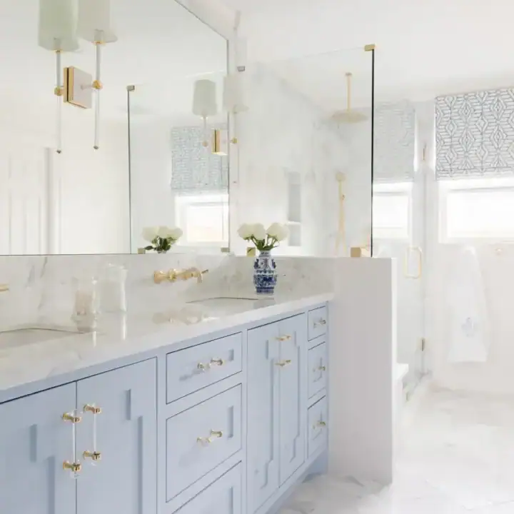 Soft Blue Cabinetry, Polished Marble Surfaces & Bright Glass Shower Walls