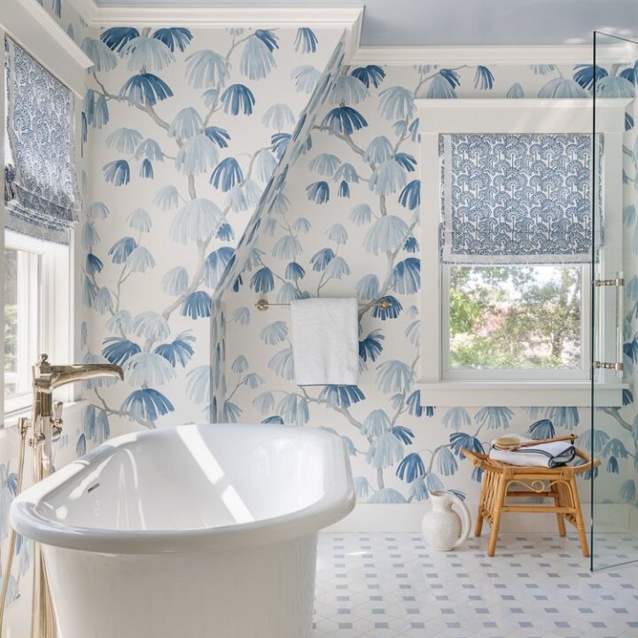 Bold blue wallpaper and a sculptural tub instantly catch your eye, creating a coastal bathroom that feels playful and luxurious.
