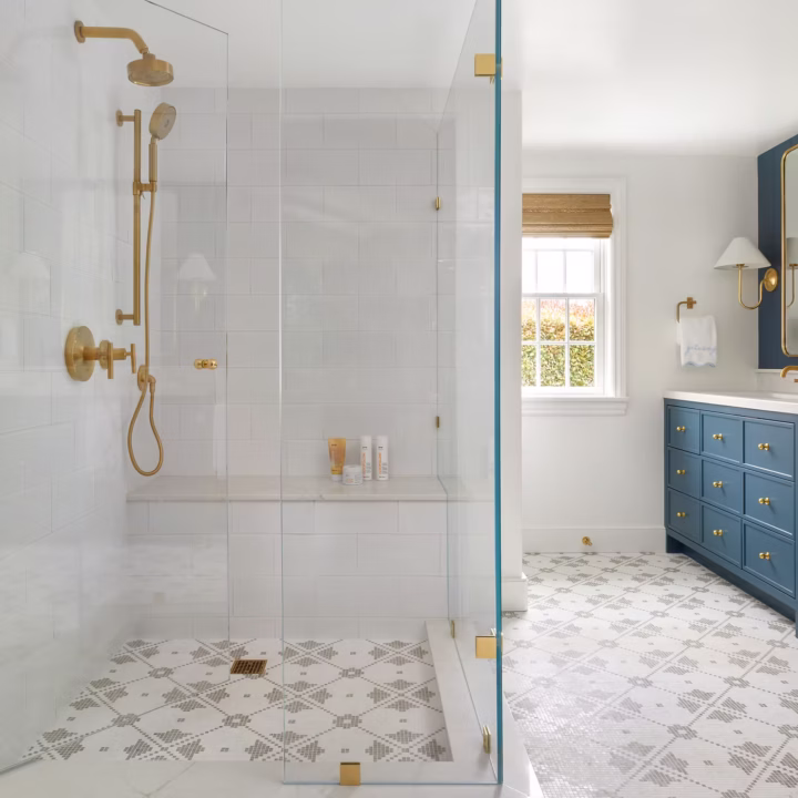 Clear Glass Shower Walls, Warm Brass Fixture & Soft Patterned Tile Floors