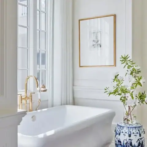White Bathroom With Classic Brass Fixtures & Blue And White Ceramic Accent