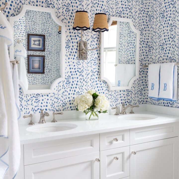 Blue Patterned Wallpaper, Crisp White Shaker Cabinetry & Woven Shade Sconces