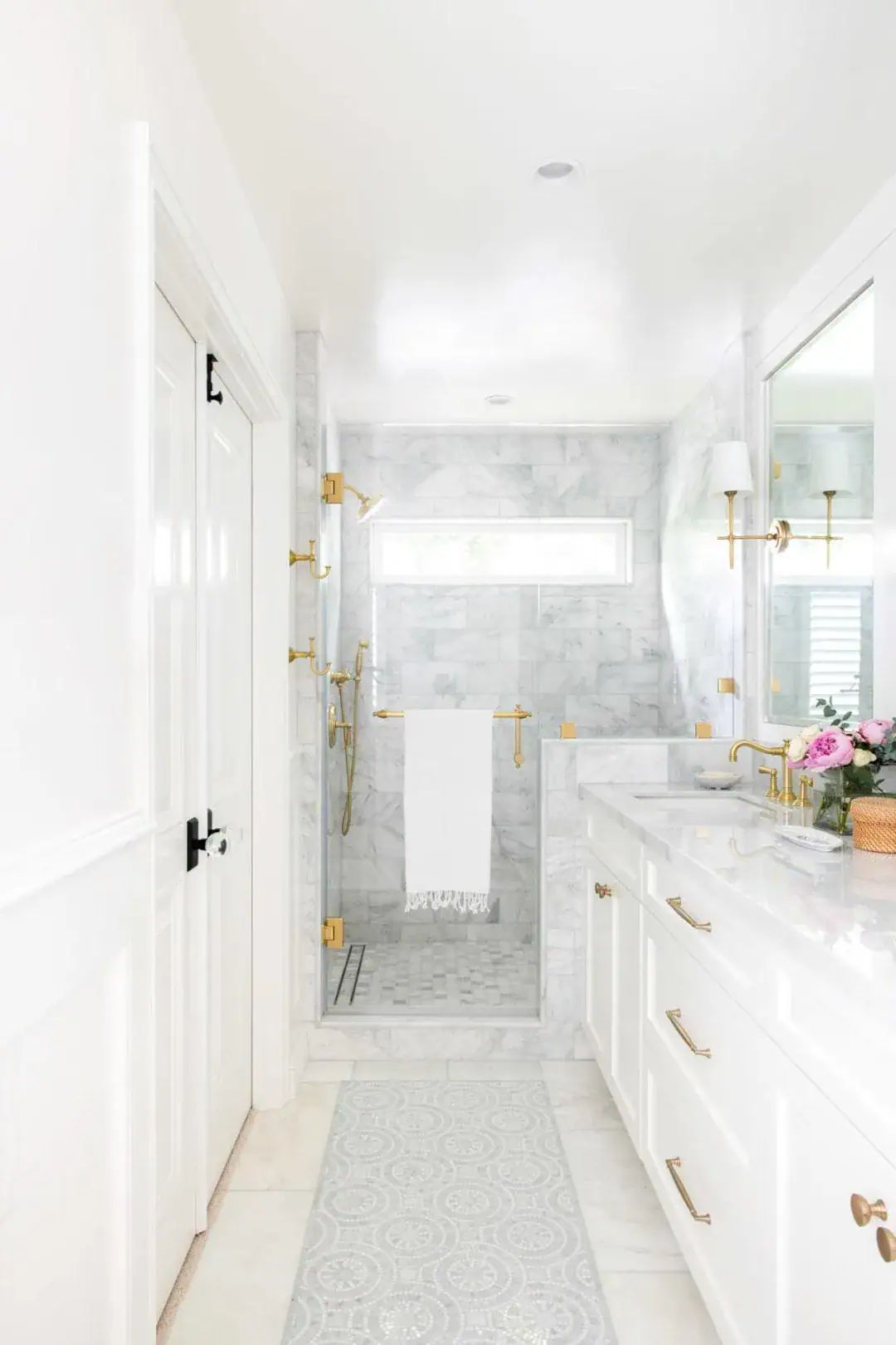 This bathroom proves that simple can still feel stunning, with crisp whites and gentle gray tones setting a serene coastal mood.