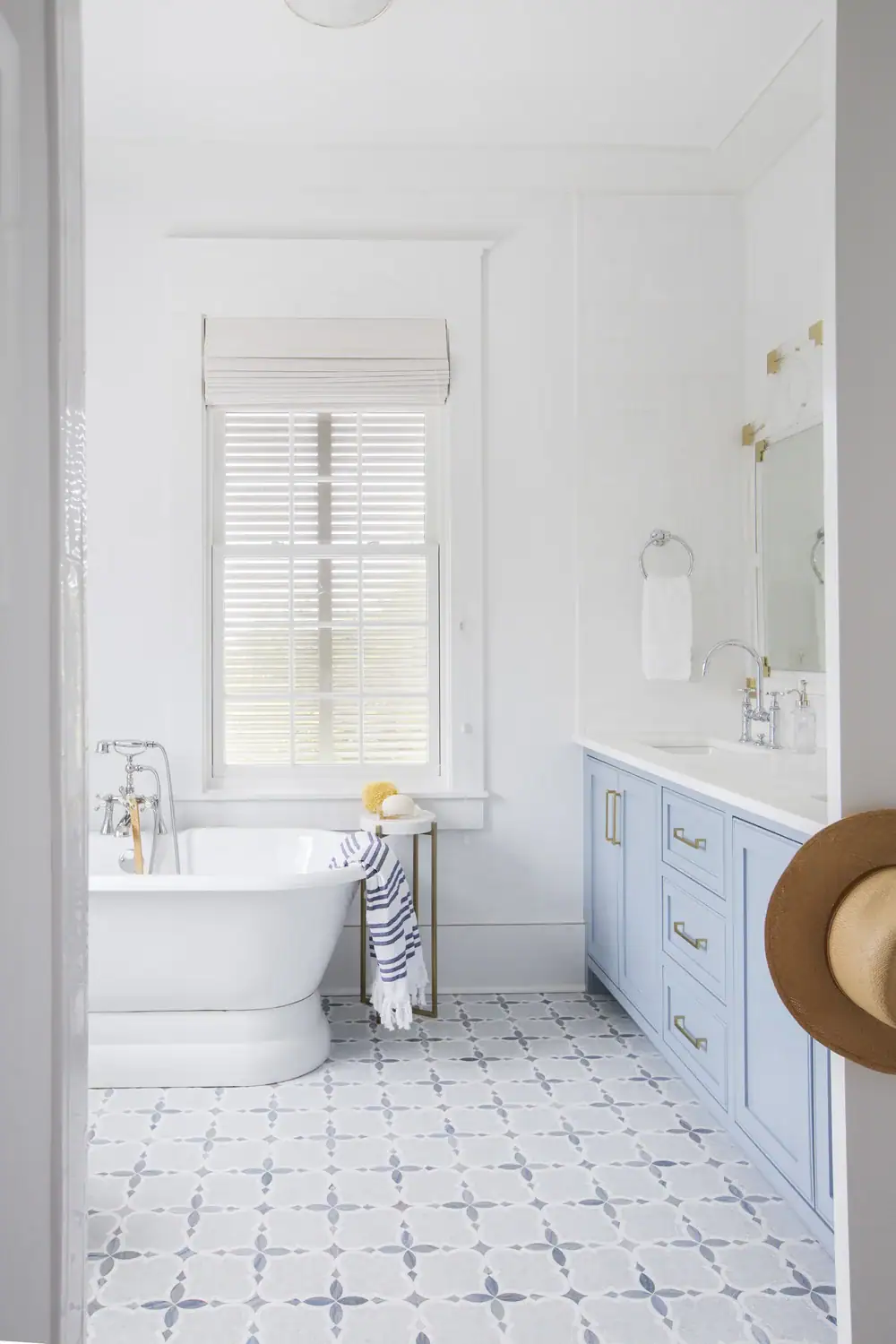Soft blue tones remind you of the ocean and sky, and they bring such a peaceful feeling into your bathroom every single morning.