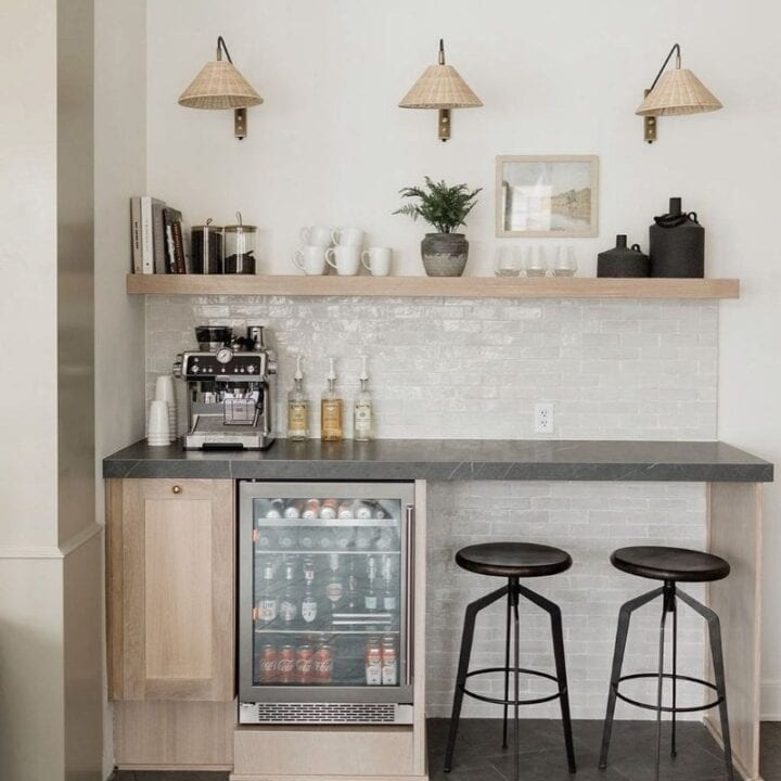 Floating shelves are a great way to utilize space above a coffee bar that does not have a cabinet.