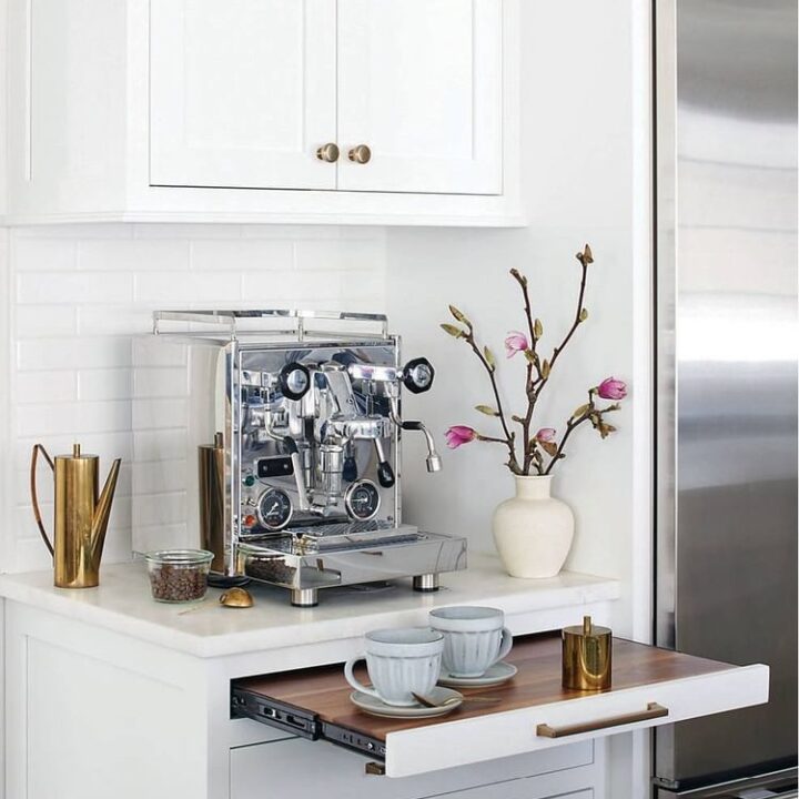 You can also install wall shelves for a little extra space. Incorporating floating coffee bar ideas on an empty kitchen wall can create a stylish and functional coffee station.
