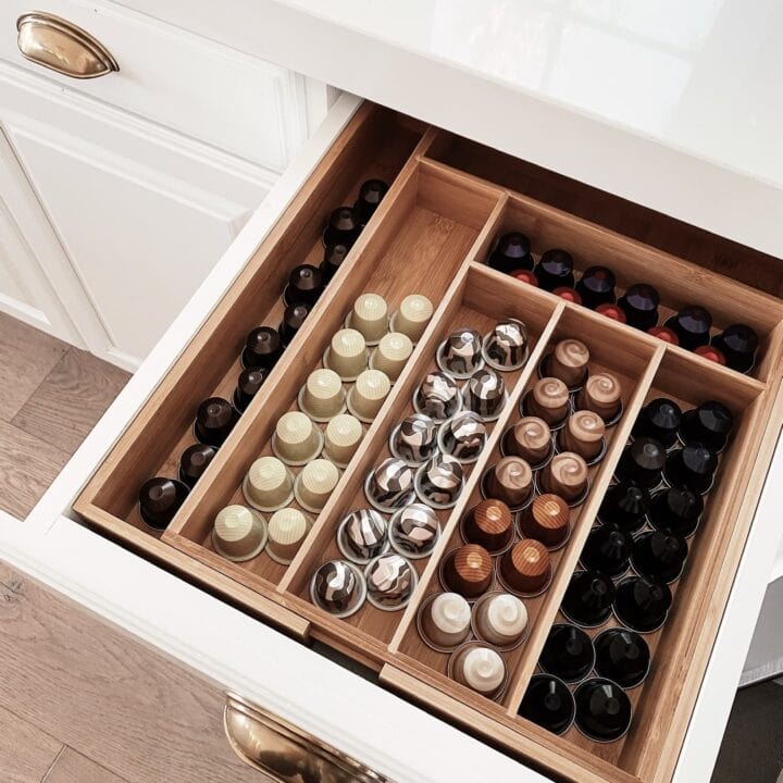Using drawer organizers to house all your coffee pods is a great way to add space for your different coffees.