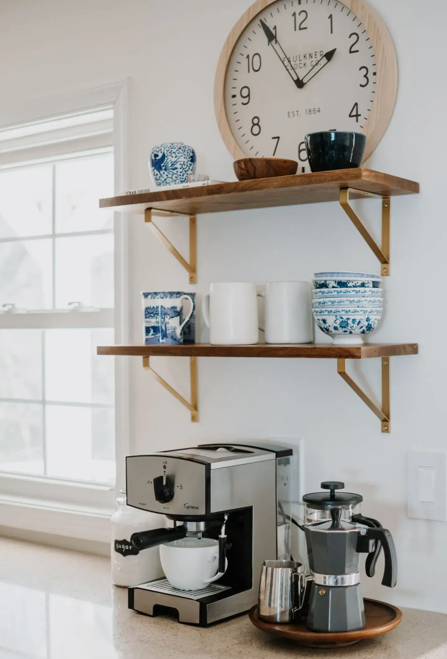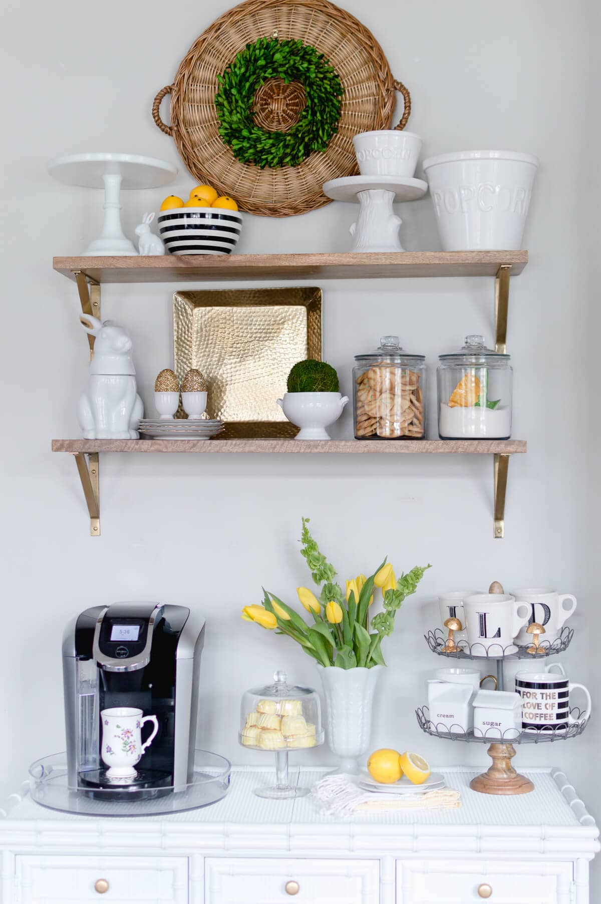 Wall shelves or floating ledges are perfect when you need extra room for jars, mugs, or cute little decorative coffee accents.