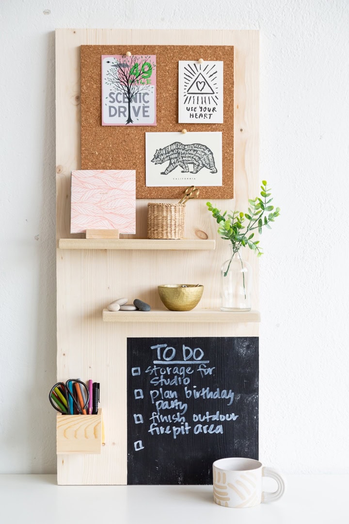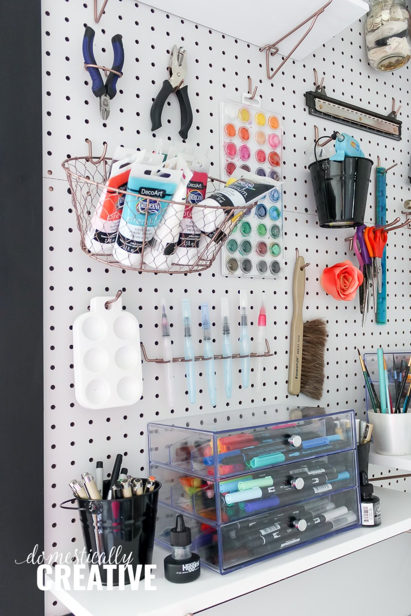 A pegboard hung on the wall lets you customize your storage with hooks and small baskets, and you can rearrange it anytime your needs change without drilling new holes or starting from scratch.