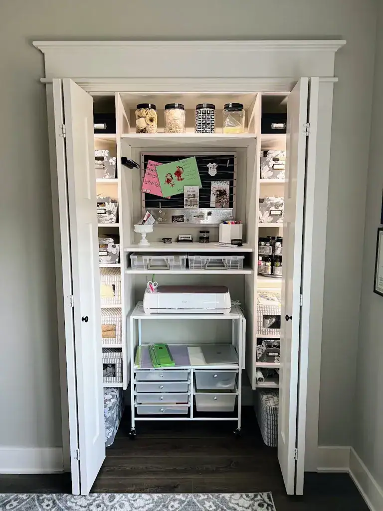Use clear bins or jars on your shelves so you can see exactly what you have without opening lids or moving things around, and they stop you from buying duplicate supplies because you forgot what was hiding in the back.