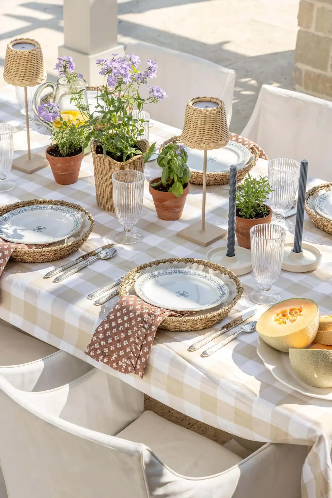 Start with the basics like table linens in lighter fabrics such as cotton or linen that feel breathable and relaxed for the warmer weather ahead.