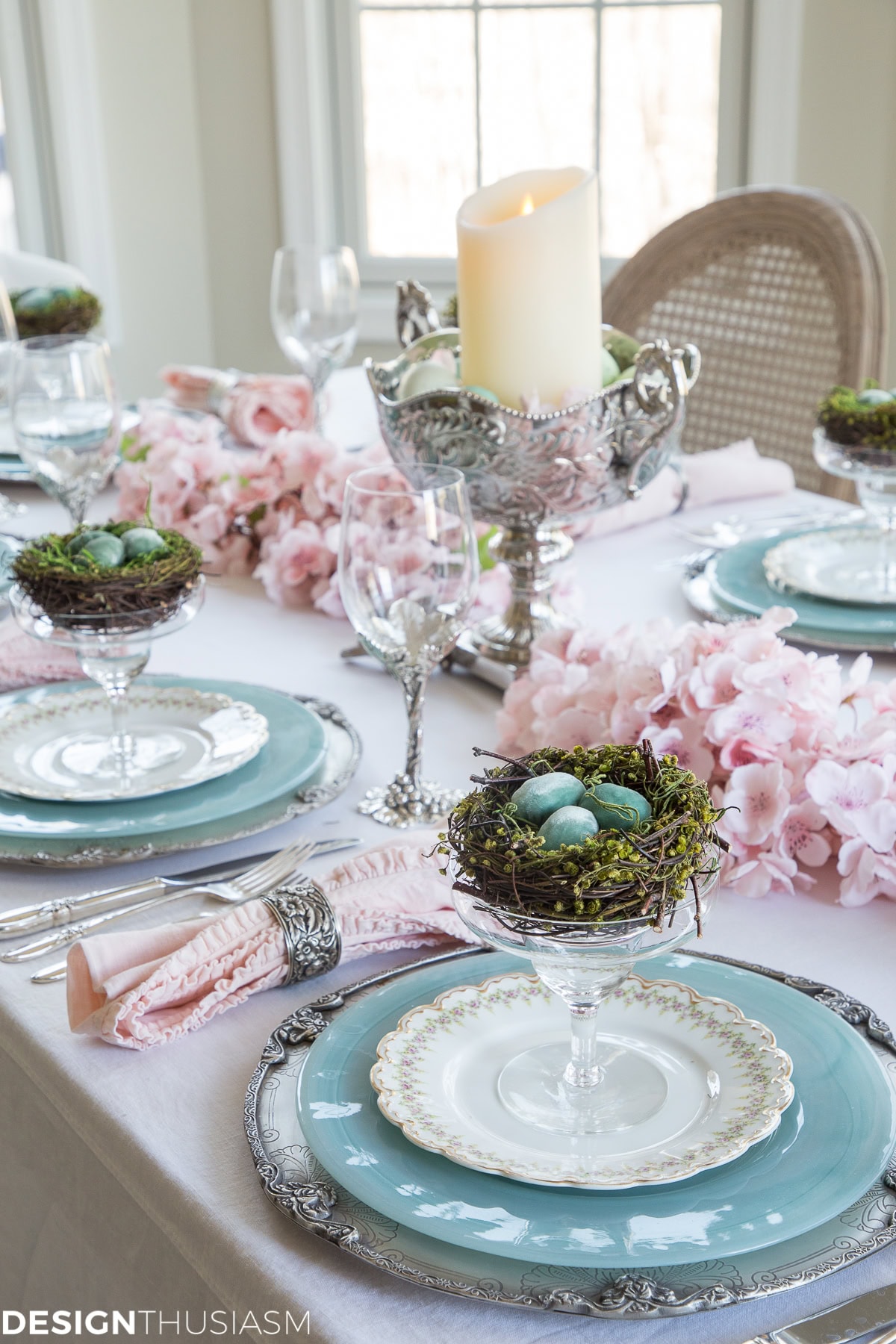 You can also create seasonal centerpiece designs using items like nests with faux eggs or stacks of vintage books topped with candles and blooms for height, perfect for Easter table centerpieces ideas.