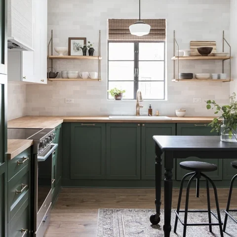You can not go wrong with natural wood accents. Incorporating natural wood elements, such as a butcher block countertop or open shelving, offers a timeless and organic counterpart to dark green cabinets. This combination provides a rustic yet sophisticated ambiance.