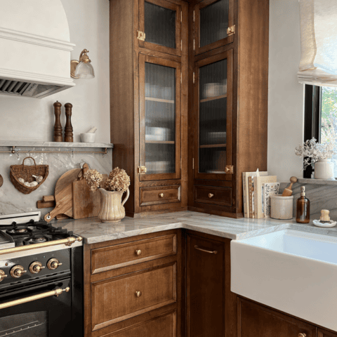 Deep wood cabinets and brass pulls make it feel timeless and elegant.