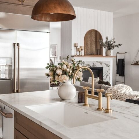 Golden hardware and a dark island bring a timeless warmth.