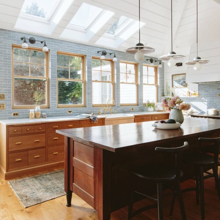 This kitchen embraces natural light with sky windows above classic wood cabinets and a light blue brick backsplash.
