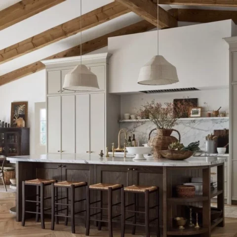 Woven stools and marble counters add contrast, making this space feel rich but grounded.