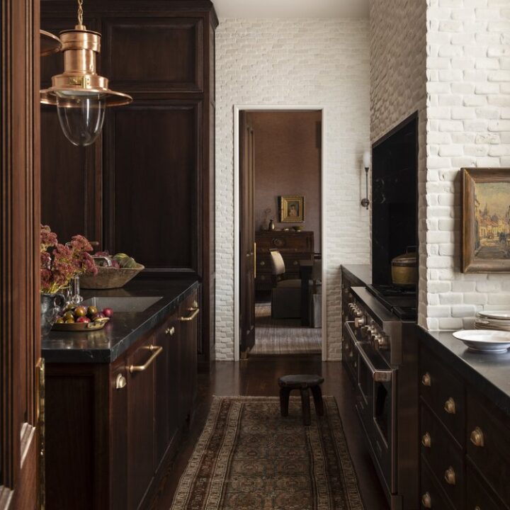 A moody galley-style kitchen feels elevated with dark cabinetry, bronze fixtures, and textured white brick walls.