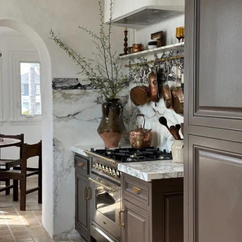 Designers are combining deep cabinet finishes with natural textures and mixed metals to create kitchens that feel personal and not overly styled.