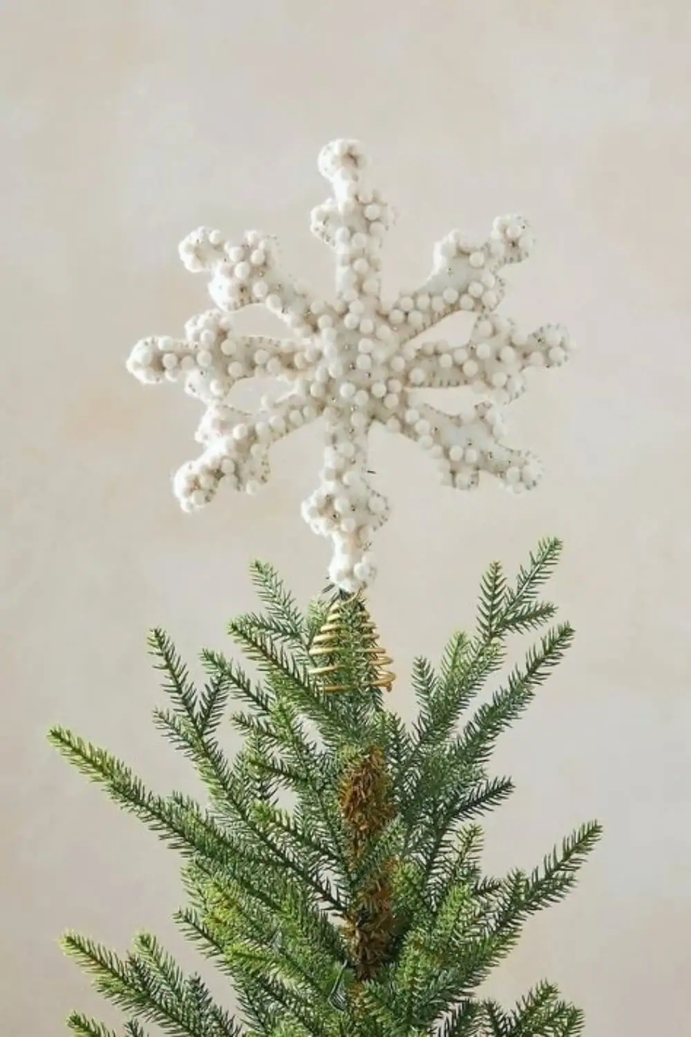 If your tree is flocked or covered in white lights, a clear or mirrored topper can reflect the light and give it a soft, modern glow.