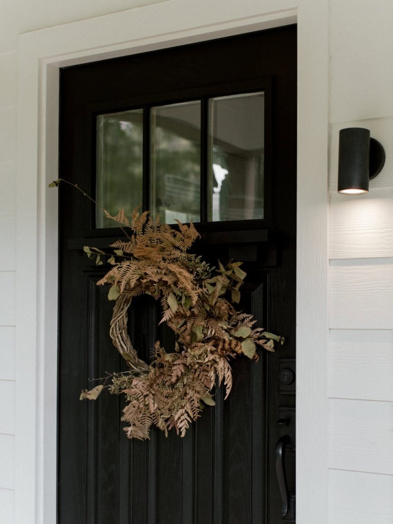 A neutral wreath made of dried flowers or soft leaves hung on your front door creates a calm and natural touch for your entry.