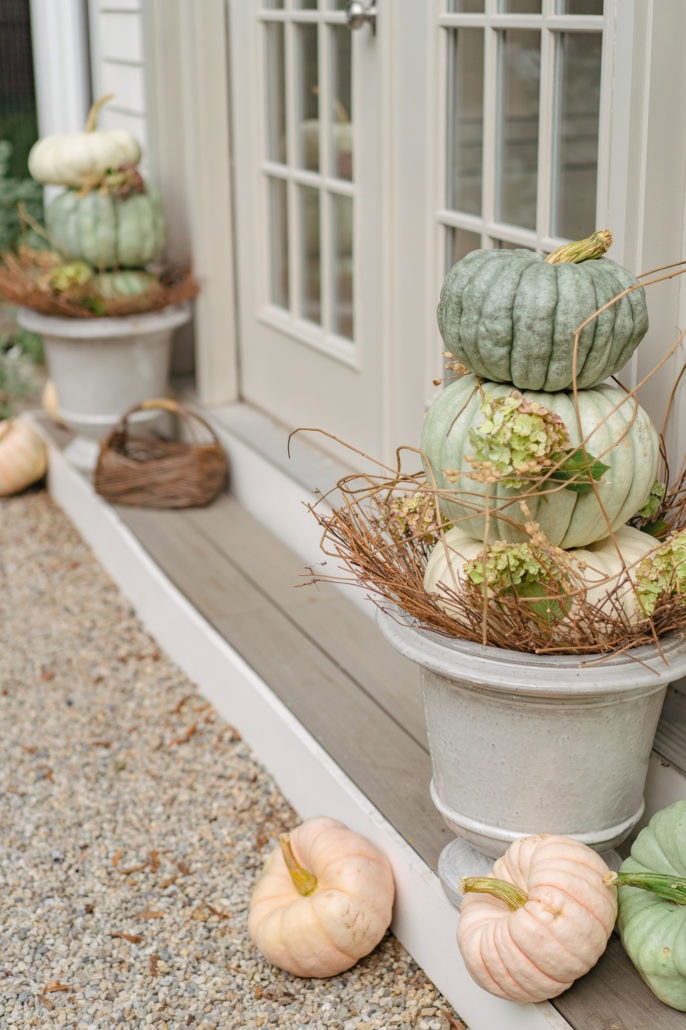 Mini pumpkins in white and tan grouped in odd numbers on steps or crates help bring structure without taking over the porch.