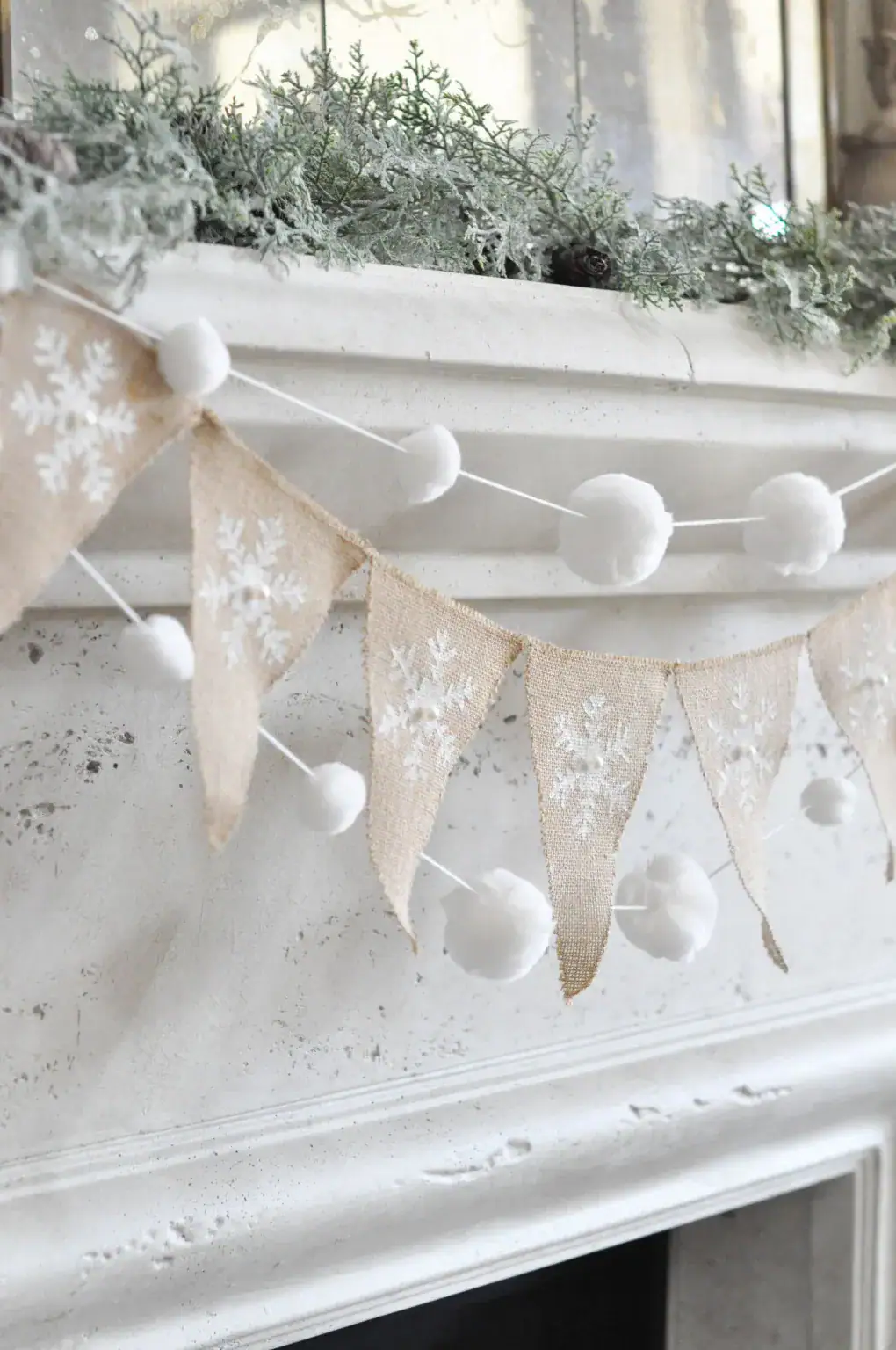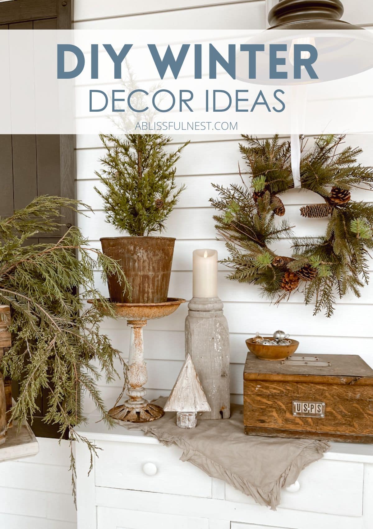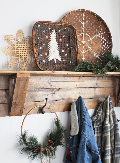 Natural materials like pinecones, branches, wood, and evergreen clippings work beautifully because they bring outdoor winter textures inside your home. Add white paint and battery lights.