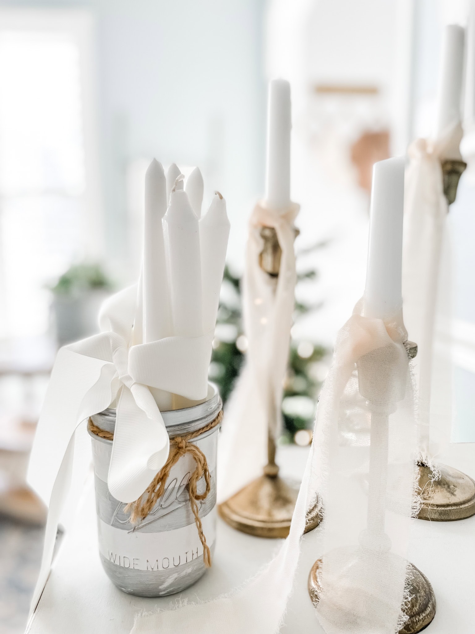 Layering white fabric or lace over tables and shelves adds soft winter texture without requiring sewing skills or any kind of crafting background.