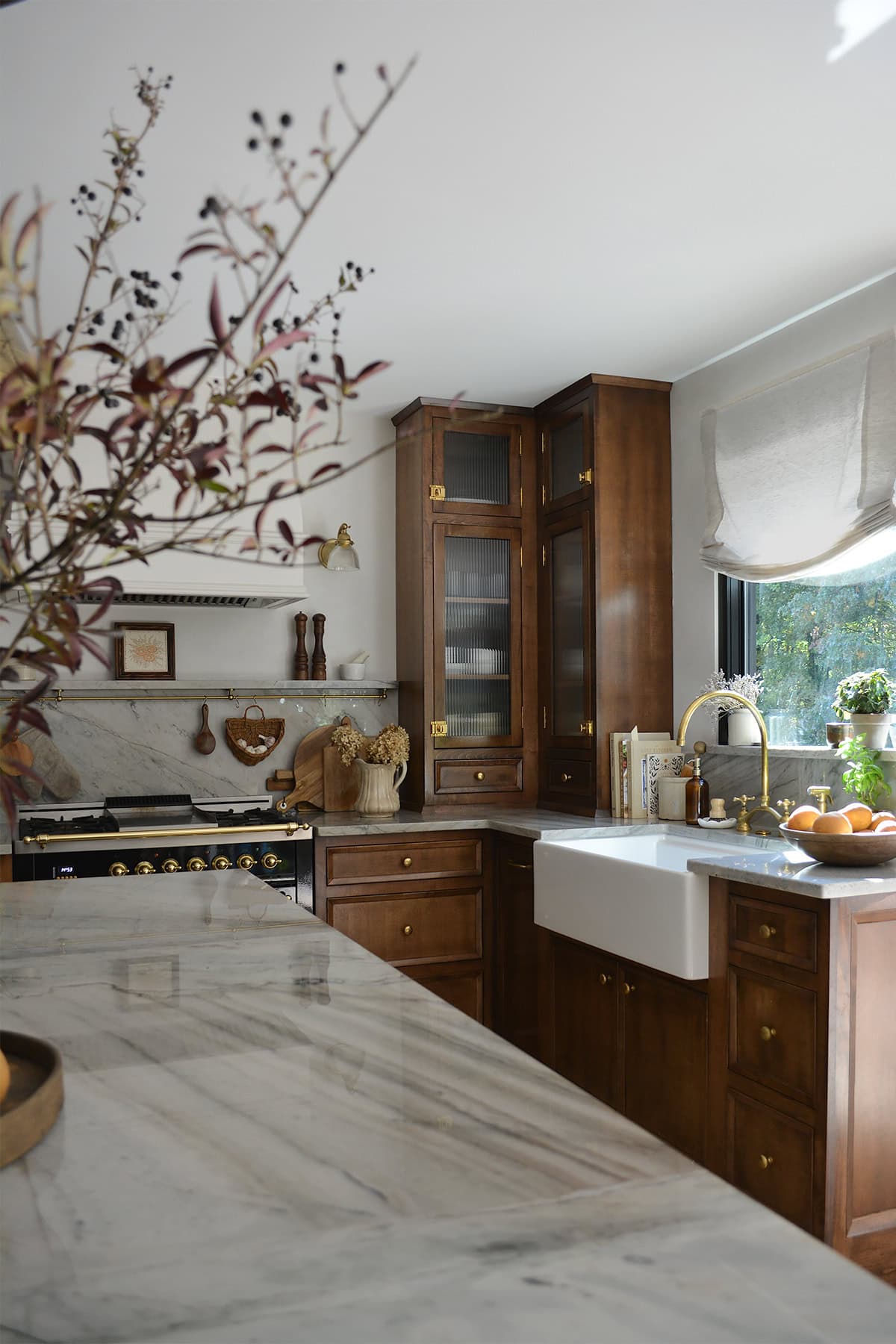 For homes with plenty of natural light, deep walnut or natural wood kitchen cabinet finishes add richness and contrast.