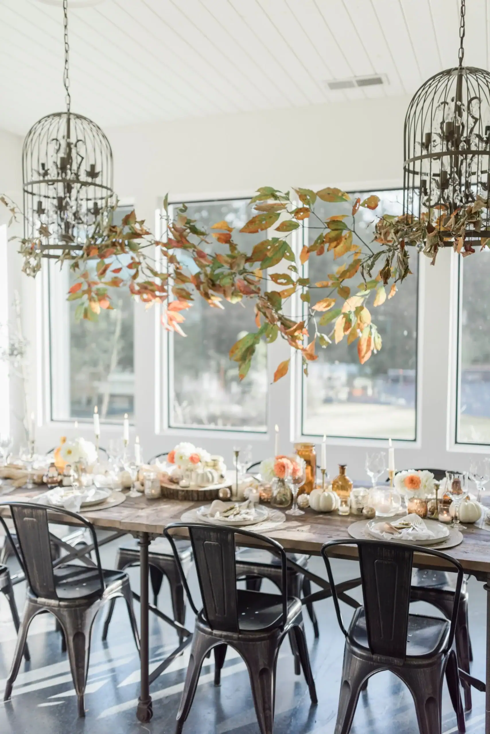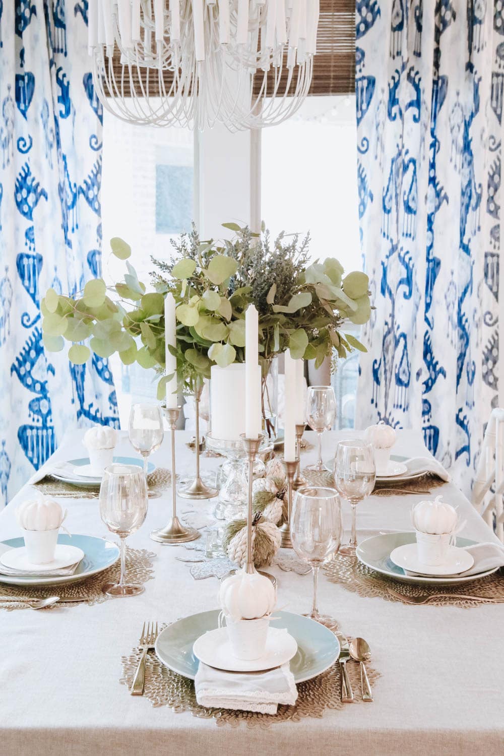 Even a minimalist centerpiece idea, such as one tall vase of greenery, adds a touch of beauty while keeping the Thanksgiving tablescape simple and chic.