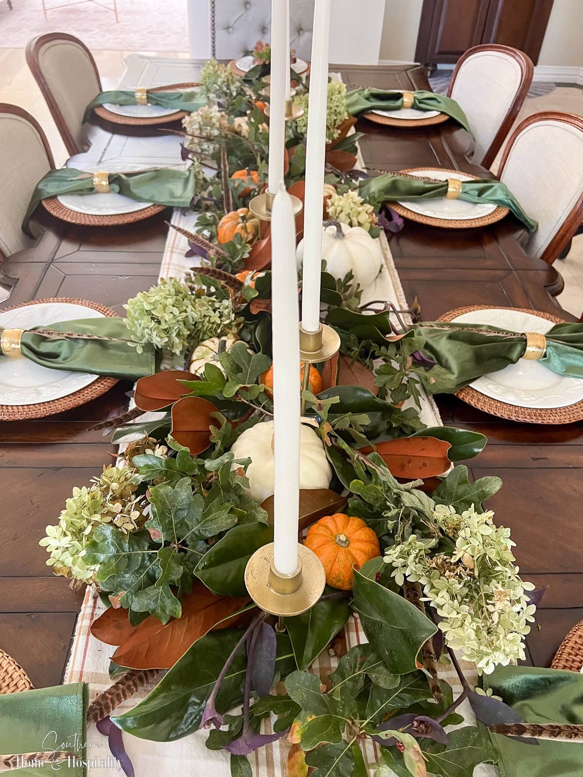 Fresh fall leaves arranged with candles in simple holders give height and warmth while still allowing guests to talk across the Thanksgiving tablescape.