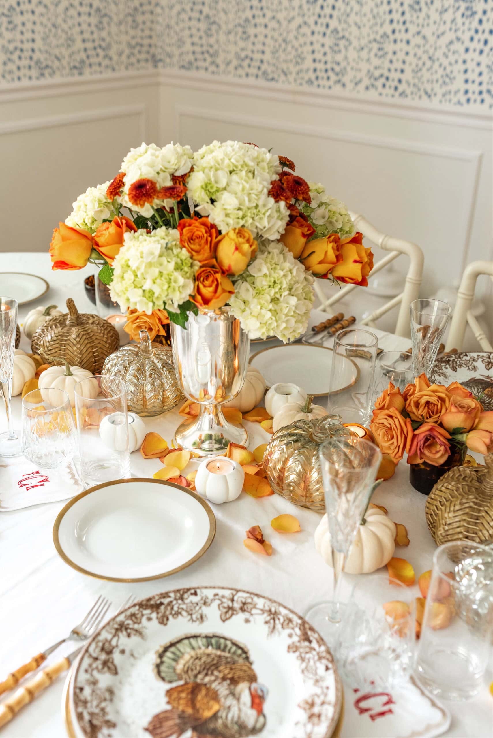 Fresh flowers or seasonal greenery mixed with mini pumpkins can elevate your Thanksgiving tablescape, making it beautiful without feeling fussy or overly styled.
