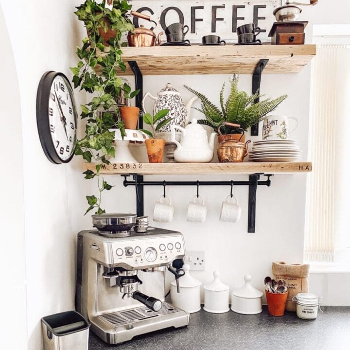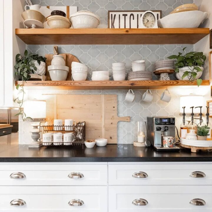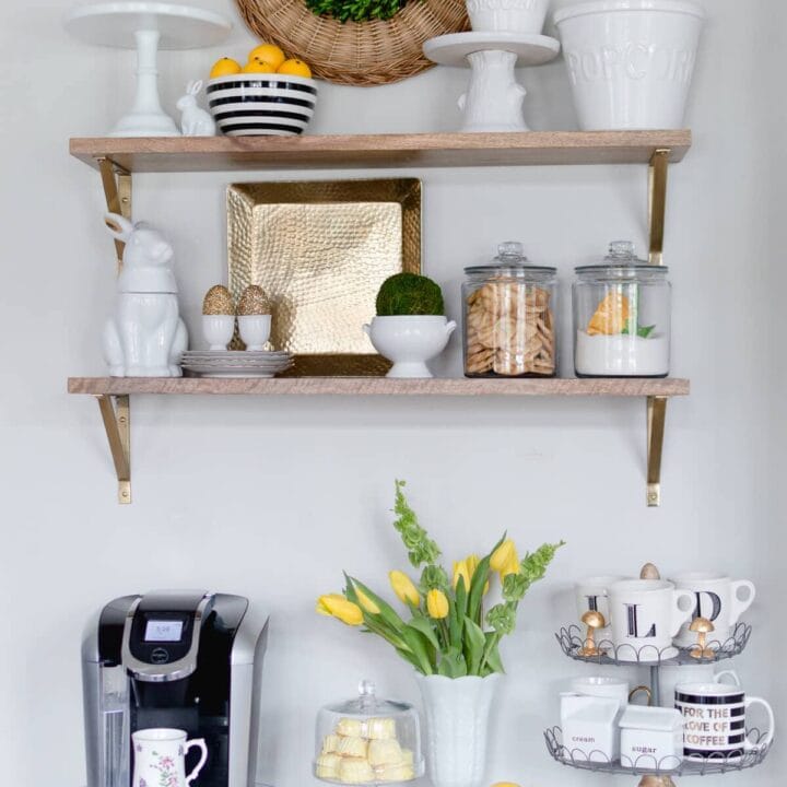 Add open shelves, beautiful dishware, and mugs to your coffee bar setup to showcase your style and keep things organized.
