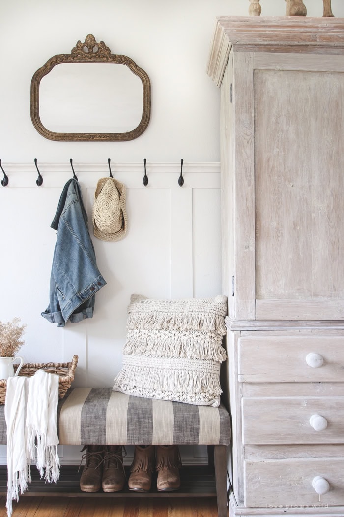 A small bench with storage underneath gives you a spot to sit while putting on shoes and keeps the area from getting messy.
