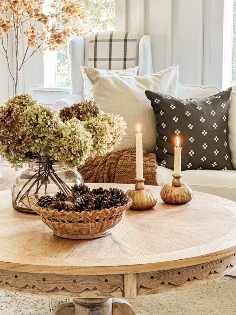 Keep just a few simple fall accents on the coffee table, like a candle or tray with pinecones, and tuck the extras away to avoid crowding.