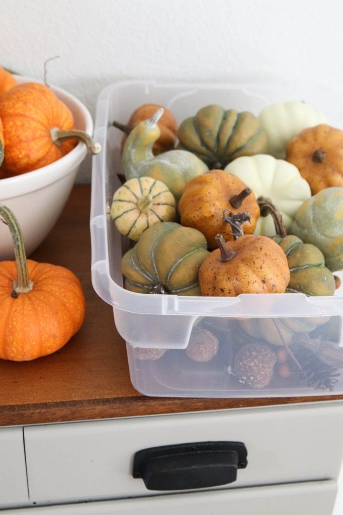 Label storage bins clearly based on room or category, such as “living room fall decor” or “entryway accessories.”