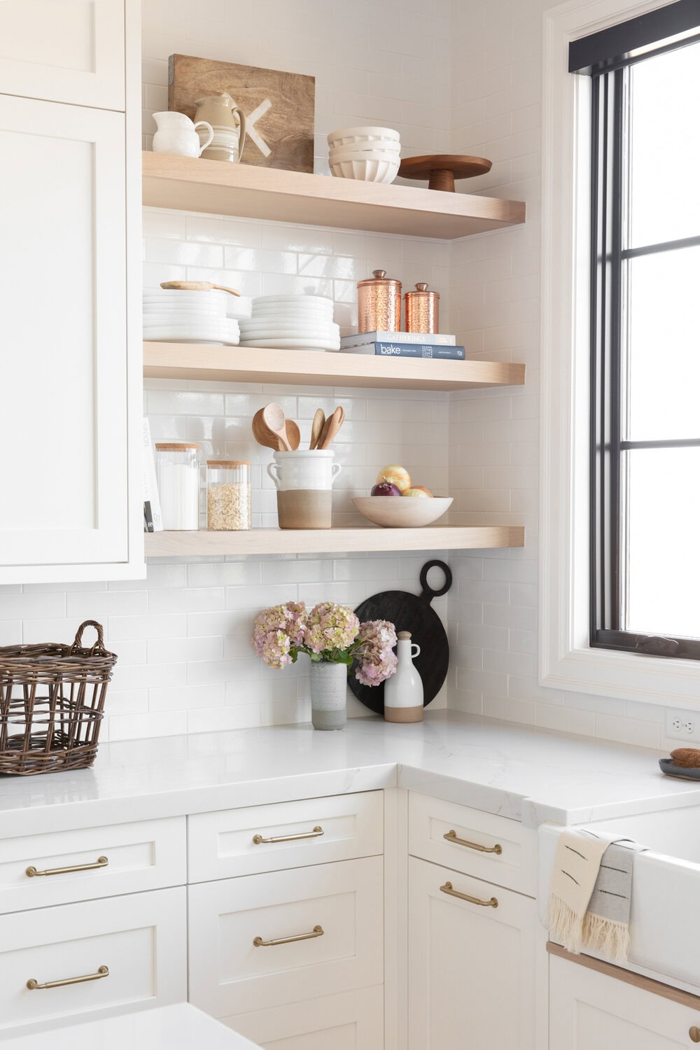 Start with open shelves or glass-front cabinets that let you show off your favorite dishes, vintage jars, or stacked cutting boards.