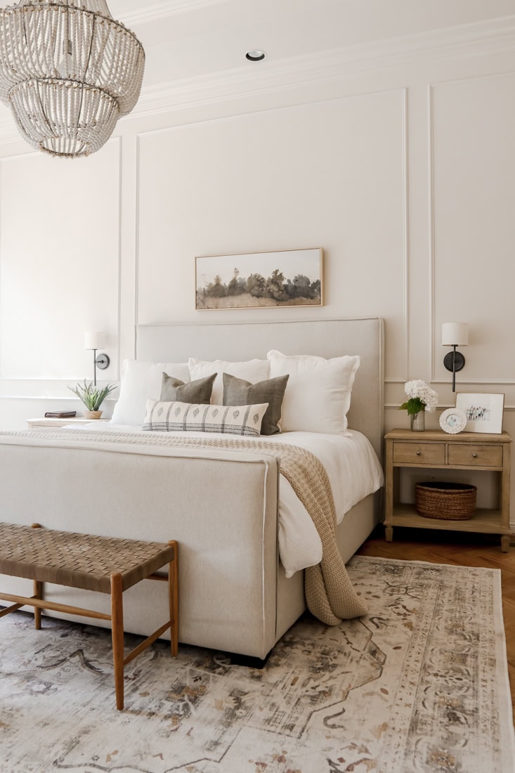 Add a bench at the foot of the bed or a small woven chair in the corner to create a cozy reading or resting spot.