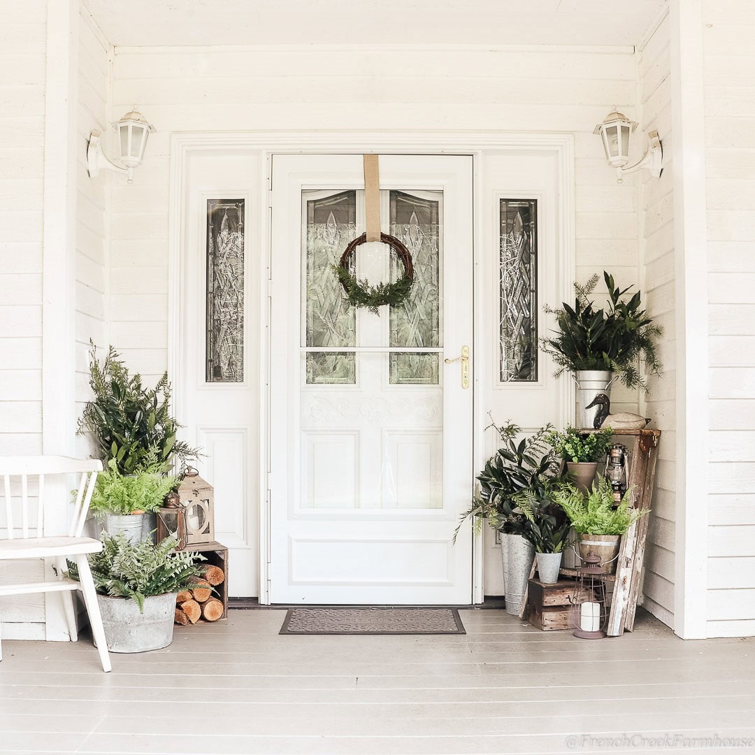 Cool whites, soft grays, and deep greens create a calm, cozy look that works perfectly for front porch winter decorations all season long.