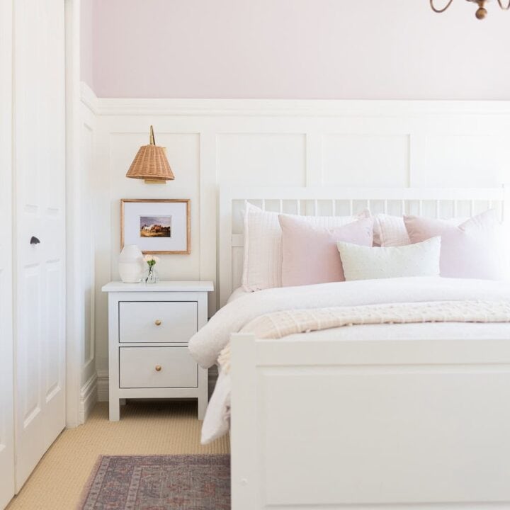 This room’s soft blush tones mixed with creamy neutrals feel so calming and chic.