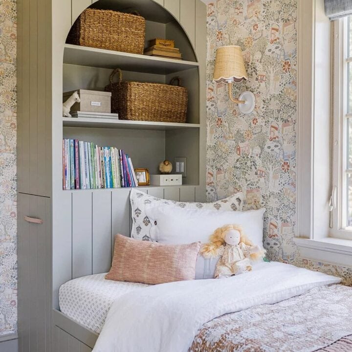 This built-in bed nook with whimsical wallpaper and woven baskets is all about combining function and style.