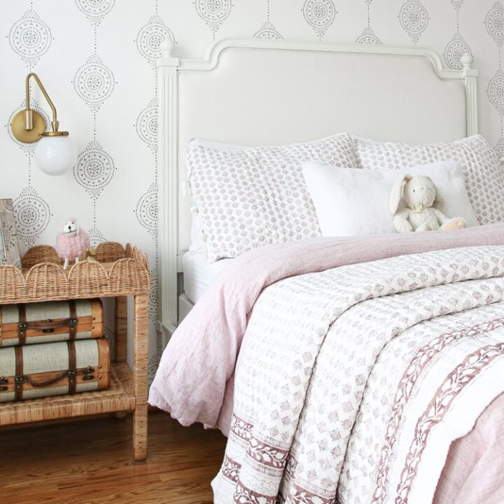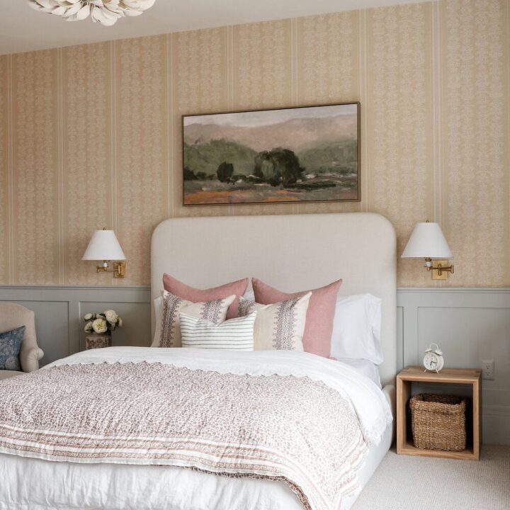 This pink-themed room with patterned wallpaper and soft bedding feels like stepping into a cozy daydream.