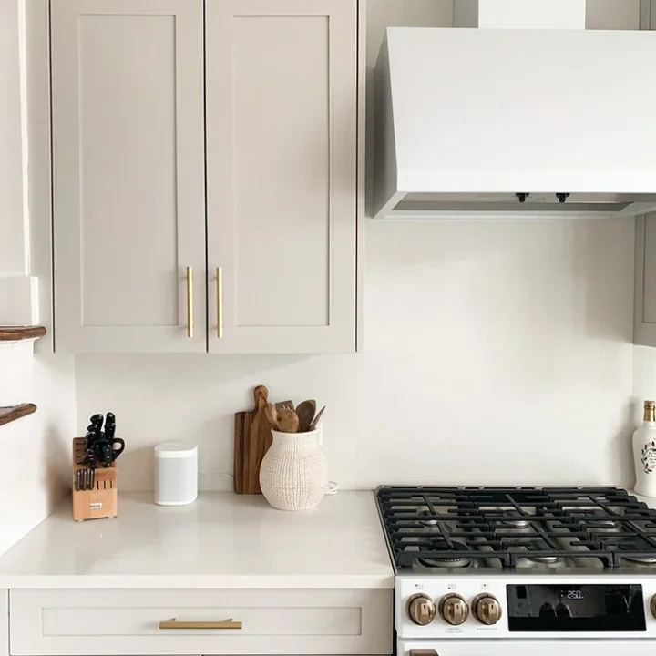 Mindful Gray by Sherwin Williams is a neutral gray color with a slight greenish undertone that can look beautiful on kitchen cabinets.