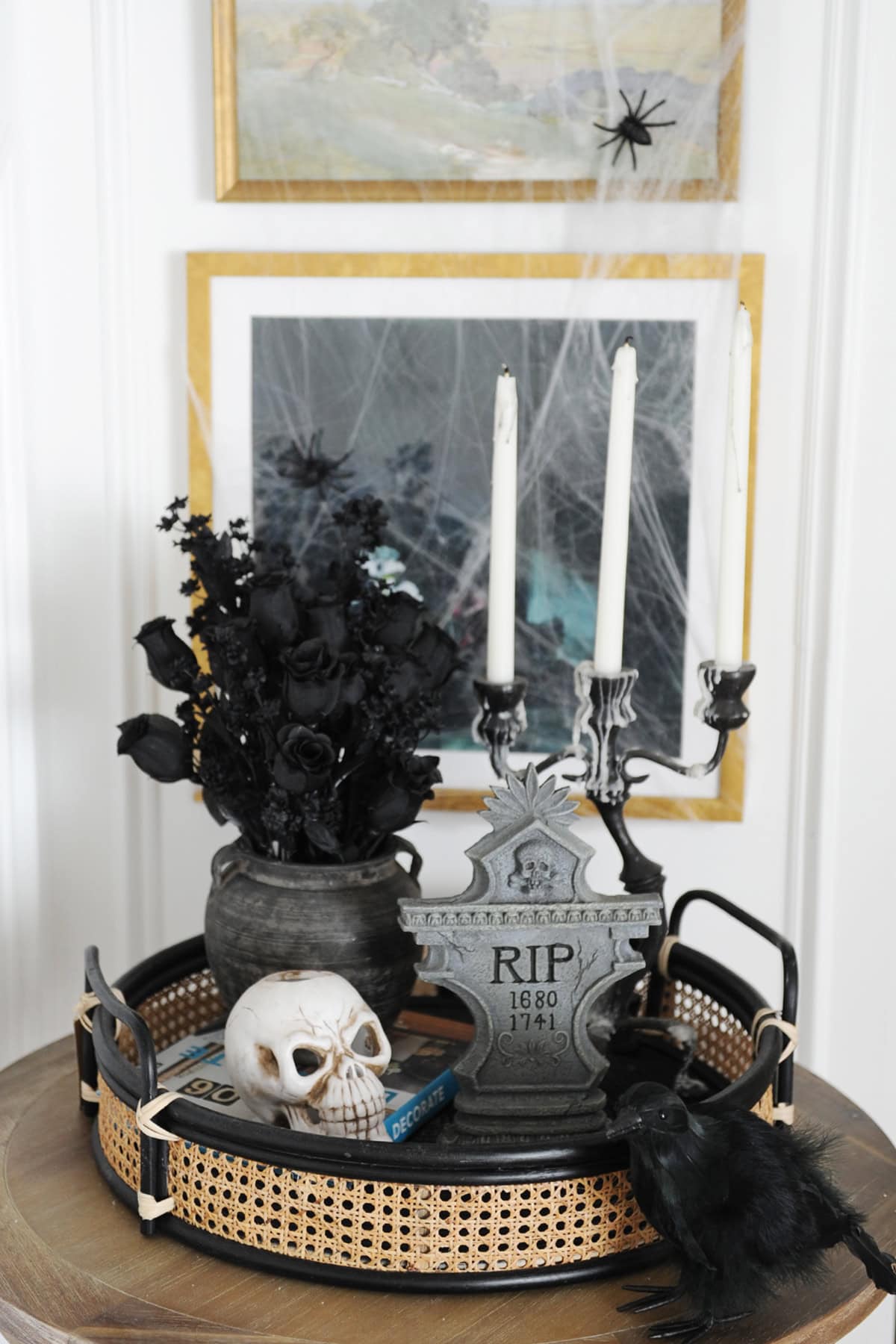 You can keep things feeling mature and cohesive by pairing everyday pieces like glass vases, wood trays, or candles with just a few spooky seasonal accents.