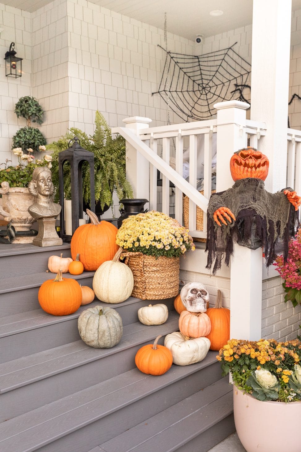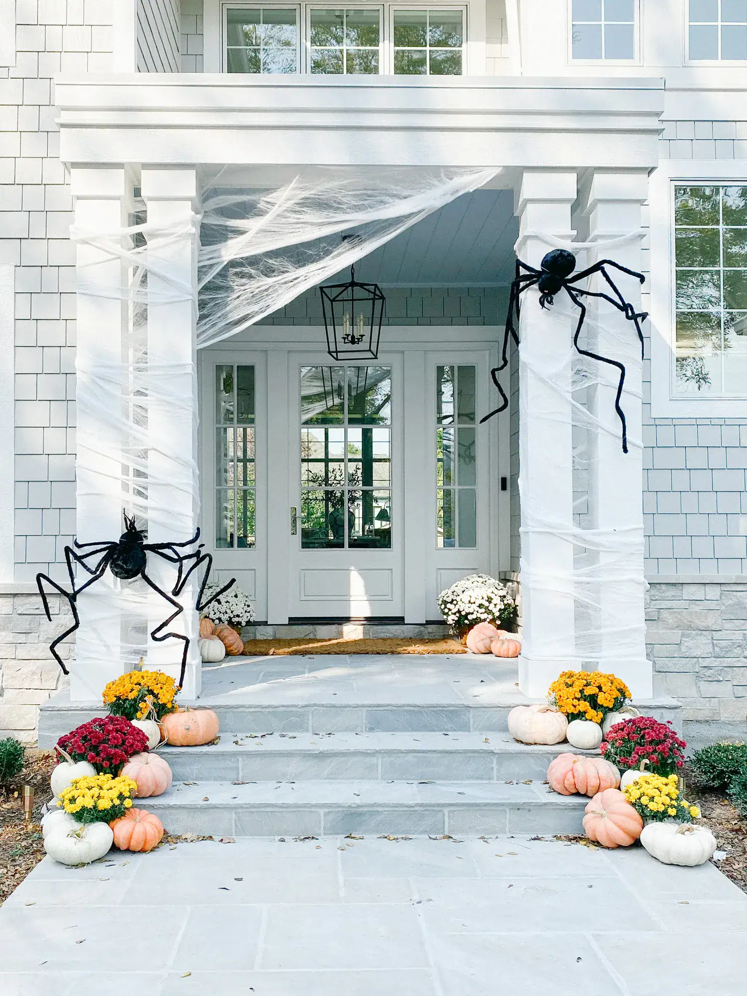 Start with small touches like pumpkins, spiderwebs, and string lights to create a spooky feel without spending too much. Use front porch steps, doorways, or mantels as focal points to show off the theme in a simple and fun way.