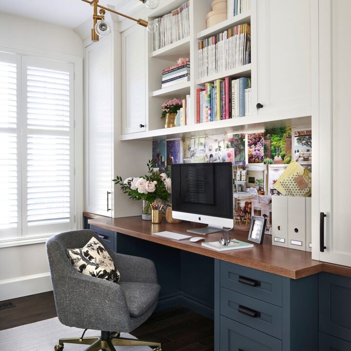 A built-in office nook combines deep navy lower cabinets with white upper shelves for a stunning contrast.